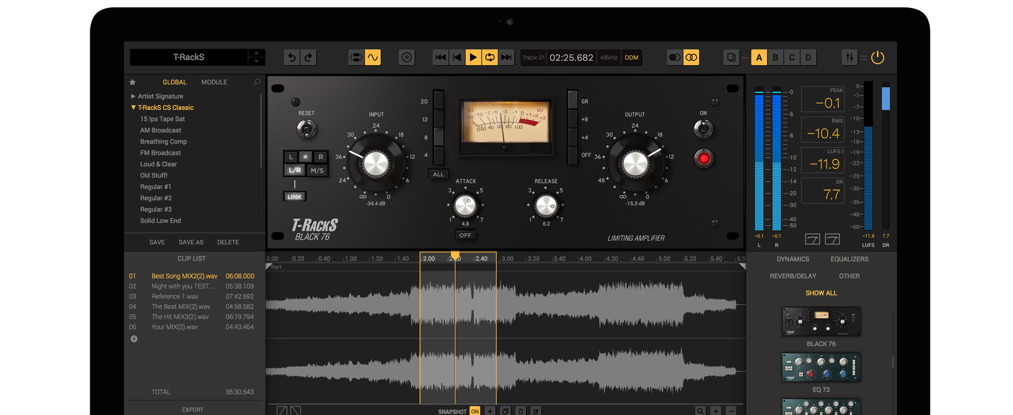 ドラム、ドラム・サブ・ミックス、ボーカル、ベース、ギター、ピアノ、コーラス、ブラスからストリングスまで、このコンプレッサーは何にでも使えるでしょう。ただ通しただけでも、音楽的な「いい音」になってくれるからです。ボーカルに使った時に感じられる存在感、安定、明瞭度とパンチは、他の機種では代替えできないものがあります。ドラムなら、パワー、密度を高めながら、スナップのレベルも完全にコントロール可能。ギターに使ったときはまさに魔法のようで、独特の中音域の特性により「良く鳴り、歌う」音になります。Black 76 Limiting Amplifierには、ステレオ・リンクの他、M/Sモードも装備されているので、ミックス・バス、マスタリングでも活躍するプラグインになるでしょう。