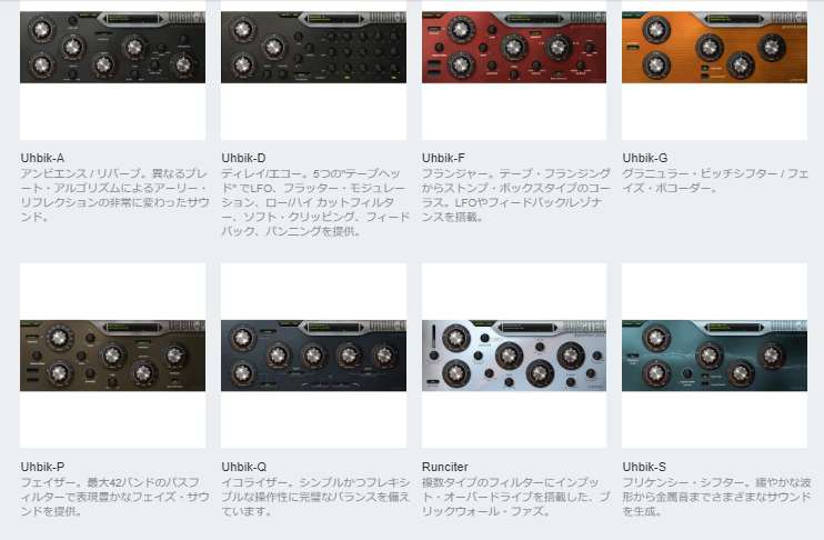 - Uhbik-F:フランジャー。テープ・フランジングからストンプ・ボックスタイプのコーラス、LFOやフィードバック/レゾナンスを搭載。