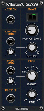 Mega Sawは、複数のデチューンされたノコギリ波の巨大な「フーバー」サウンドを提供します。最大32の同時のこぎりをCV制御可能なデチューン量で鳴らすことができます。