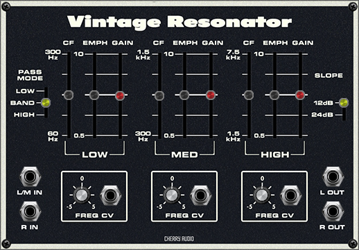 Vintage Resonatorは、クラシックなMoog Polymoogシンセサイザーの「Resonator」セクションを精細にモデル化しています。もともとはパラメトリックEQオンステロイドのようなものとして説明されていたレゾネーターセクションは、並列構成の3つの状態変数フィルターで構成され、それぞれが周波数スペクトルのチャンク(低/中/高)で動作します。