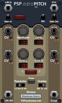 入出力ゲインや、最大上下1オクターブの半音調整、最大上下100セントの調整など、基本的な機能を完備したピッチシフターです。それだけではなく、各チャンネルを個別にチューニングしたり、2つのチャンネルのチューニングを合わせることもできます。また、4種類のピッチシフト解像度(低/標準/高/非常に高い)が選択可能で、ピッチのオーバーラップは「標準/高/非常に高い」から選択できます。ピッチシフトした信号の位相を反転させることも可能。ドロップダウン表示されるウィンドウリストから、19種類のWindowを適用できます。しかも、ステレオ入出力、半音、セント、Tune L、Tune Rの個別のCVコントロールを搭載。クリエイティブなピッチシフターをお探しなら、PSP nitroPitchが最適です。