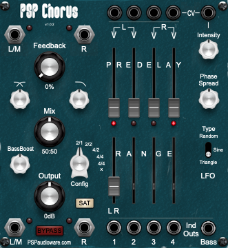 最大4ボイスのステレオコーラスをお探しなら、「PSP Chorus」が最適です。個別またはグループ単位で、プリディレイ、レンジタイム、フィードバック、ローパスフィルターの周波数、可変周波数とローブーストのクロスオーバー、ミックス、出力レベルを調整できます。最大の秘密は「出力設定スイッチ」にあります。2〜4つのボイスと1〜4つのLFOから選択でき、4つのボイスをクロスフィードさせることも可能。コーラスのかかり具合やフェージングの広がり感、LFOの種類を微調整できます。また、各ボイスのプリディレイ・タイムやコーラスのかかり具合を調整できる、個別のCVインも搭載されています。