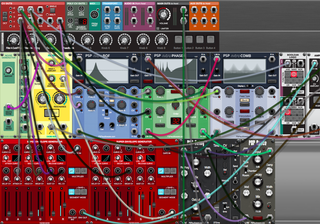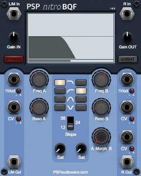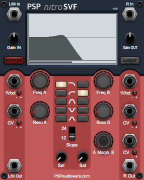 ステート・バリアブル・フィルターを追加したいなら、「PSP nitroSVF」ですべて揃います。5つのフィルタータイプを持つ2つのフィルター(AとB)と、2つのフィルターをブレンドする「morph」ツマミに加え、周波数、共振、サチュレーションのツマミも用意。マスター入出力のゲインを備え、スロープは12dBと24dBから選択可能です。有名なsoftSATサチュレーションも含まれています。マスターステレオのCVイン/アウト、周波数と共振、morphコントロールのCVインなど、CVオプションも数多く搭載されています。PSP nitroSVFは、ステート・バリアブル・フィルターに必要な柔軟性とコントロールオプションをすべて備えています。