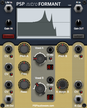 オーディオ素材のフォルマントを、クリエイティブに編集できる「PSP nitroFormant」は、PSP N2Oの柔軟なデュアル・フォルマント・フィルターをモジュール化したものです。ピッチ調整用に個別のフィルターを搭載し、フォルマントを滑らかに変形させます。また、マスター入出力ゲイン、周波数 /レゾナンス、および有名なsoftSATサチュレーションも搭載。マスターステレオのCVイン/アウトだけでなく、Pitch A/B、Resonance、Frequency、Morphを操作する個別のCVインも搭載しており、無限の創造性をもたらします!