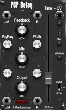 「PSP Delay」は、最小10ミリ秒〜最大2秒のモノラル/ステレオディレイ効果を得られます。フィードバック、幅、ミックスバランスを調整でき、出力ゲイン調整や、DAWに同期させることも可能。ハイパス/ローパスフィルターも備わっています。しかも、ピンポンツマミでチャンネル間の跳ね返り具合を決めたり、テープスタイルのエフェクトとモジュレーションで、サチュレーションとウネリ具合を調整できます。CVコントロールも可能で、CVタイムオフセットをパーセンテージ(±の値)で操作できます。