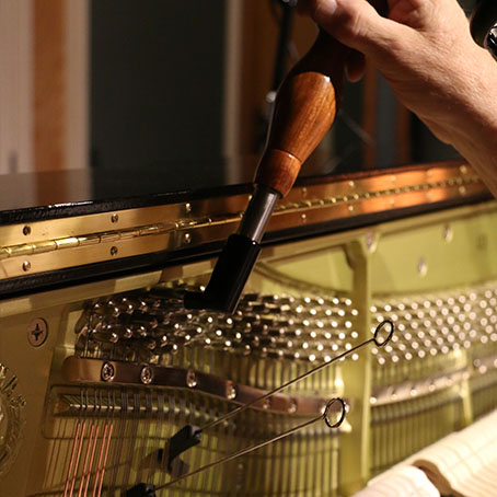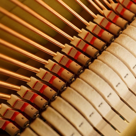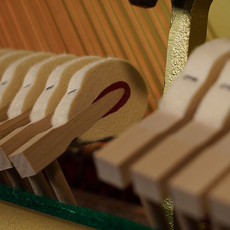 多くの過去のピアノは音色を変える機構を持っていました。一般的にはペダルまたは膝のレバーで行います。そして最も一般的でシンプルに音色を変える機構がハンマーと弦(ピアノ線)の間に何かを挟むことです。ハンマーの明るいアタックエッジを取り除き、響きを柔らかくすることが、この気候でよく用いられる手法です。この間に挟む物体の素材、サイズや位置などを調節することで、新たな表現や響きを得ることが可能です。