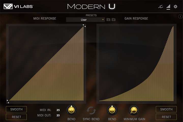 このバーチャルピアノでは、MIDIレスポンスに作用する要素を2つに分割しました。ヴェロシティは演奏タッチの強さによる響きの変化、そしてゲインカーブはヴェロシティ範囲における音量変化を扱います。受信したMIDI情報は、この2つの設定に基づいてバーチャルピアノの響きと音量変化を定義します。VL LabsのMIDI設定パネルは、そのタッチによる響きと音量変化の両方を個別に調節できる特別仕様です。これはこれまでのバーチャルピアノにはない機能です。