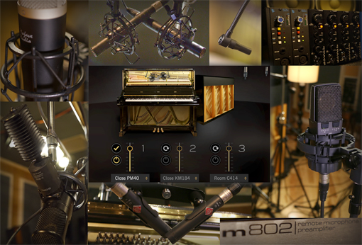 実際のスタジオでのピアノ収録は、演奏や音楽、ミックススタイルに合わせてマイクロフォンが設置されます。基本的な音色1つのみならず、様々なマイクが用意されます。スタジオグランドの場合、通常、蓋を開いた箇所にクローズとミッドマイクを立てますが、スタジオアップライトの場合は、蓋を開けてそのフロントとバックにマイクを立てることで素晴らしい響きを得ることができます。アップライトとグランドピアノは設計、構造、音の拡散パターンが異なる為、その収録の為のマイキングもかなり異なります。VI Labsの目標は、どのマイクでも究極に詳細な情報が得られ、響きが現代的であることでした。そしてマイク選びとその機能を利用出来ることにありました。