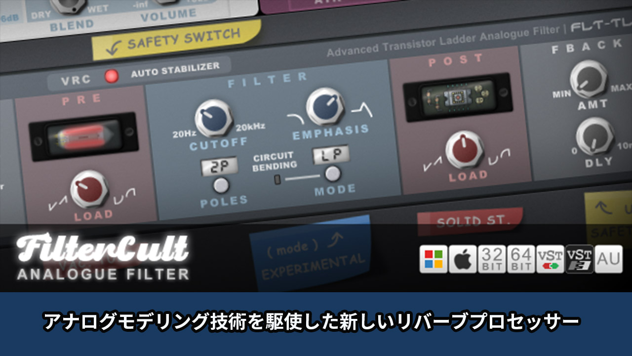 FilterCultの内部は、クレイジーで象徴的なトランジスタラダーアナログフィルターの正確なシミュレーションで構成されており、元の回路、動作を精細に再現しています。