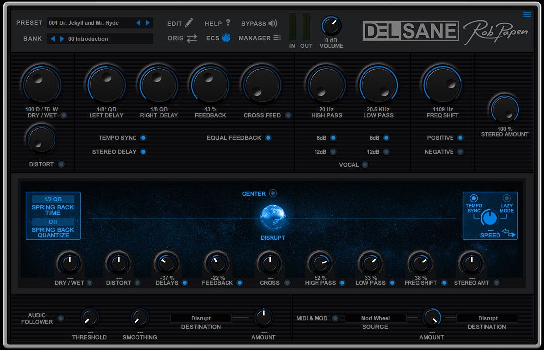 既に星の数ほどディレイFXプラグインが存在するいま、Rob Papenが「普通の」ディレイFXプラグインを世に出すわけがありません。DelSaneは、「Delay」と「Insane(正気ではない、狂気の、ヤバい、などの意)」から名付けられた通り、既存のディレイFXプラグインの想像を超えた「非常識な」ディレイサウンドを創造することができます。