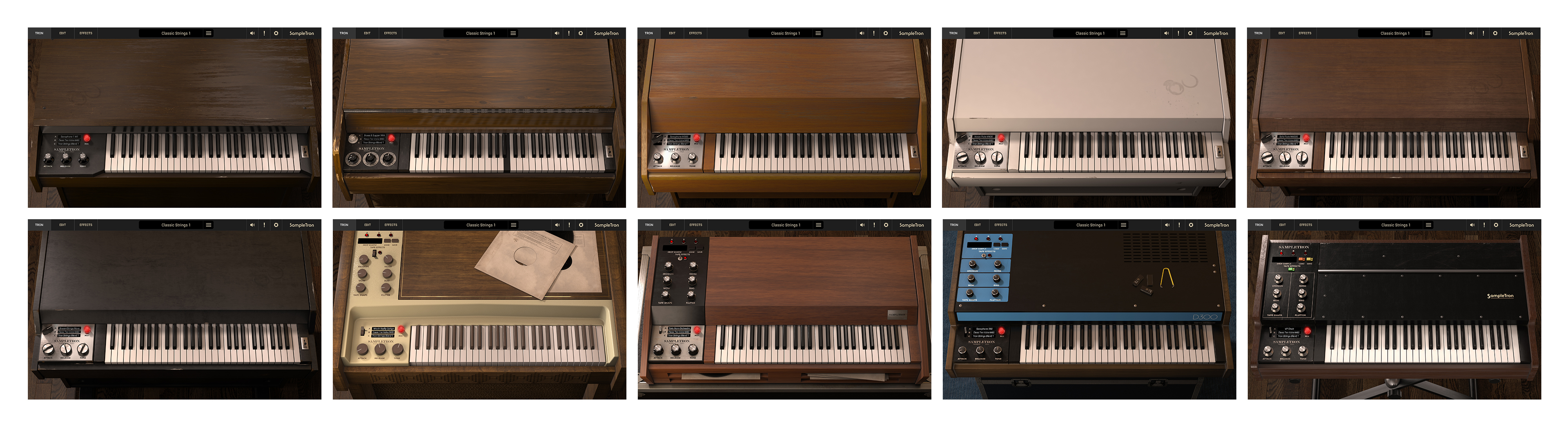 SampleTron 2は、これまで以上に優れたサウンドであることはもちろん、オリジナル実機を忠実に再現したゴージャスなインターフェースで、シンプルで直感的な操作性を実現しています。Chamberlin M1、Mellotron® MkII、M300、M400、M400S、Novatron、Mattel® Optigan、Vako Orchestron、360 Systems Digital Keyboard、Roland® VP-330と、参照された各モデルを基に細部に至るまで美しく描写されており、実際のビンテージ実機を使用しているかのような臨場感を味わうことができるでしょう。