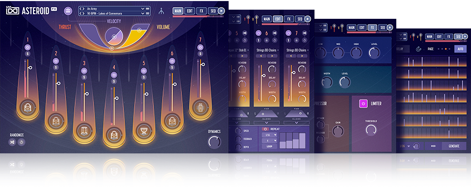 Asteroidの基本設計は直観的で扱いやすさにあります。シンプル操作の画面上に複雑に絡み合ったレイヤーと素晴らしいサウンドのリズミックインパクト、シーケンス、エフェクトを生み出すために必要なすべてを提供し、即座に生み出せるようにデザインされています数百のプリセットからテイストに合致したものを選び、そこから仕上げていくことも、最初から始めたり、ランダマイザーを活用して無限の構成を探りながら作成したりするも可能です。エディット画面ではサンプルの選択から空間ミキシングのためのボリュームとエフェクトセンドの調節、トランジェントコントロール、EQ、マルチエフェクトなど、サウンド編集に必要なツールが全て用意されています。7つのレイヤーは個別に演奏したり、あるいはバスエフェクトを活用した壮大なシーケンスフレーズを作成したりすることが可能です。すべて、画面から離れることなくおこなうことが可能です。