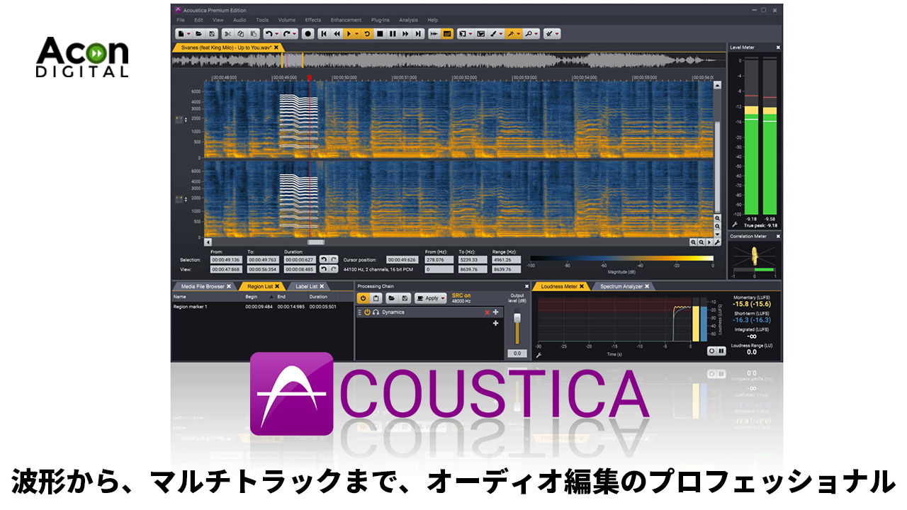 Acousticaは、最大32bit/384kHzに対応したすべての作業を最高品質でおこなえる最先端のオーディオエディターです。さらにAcoustica Premium Editionは、5.1や7.1サラウンドのマルチチャンネルオーディオ録音と編集にも対応します。