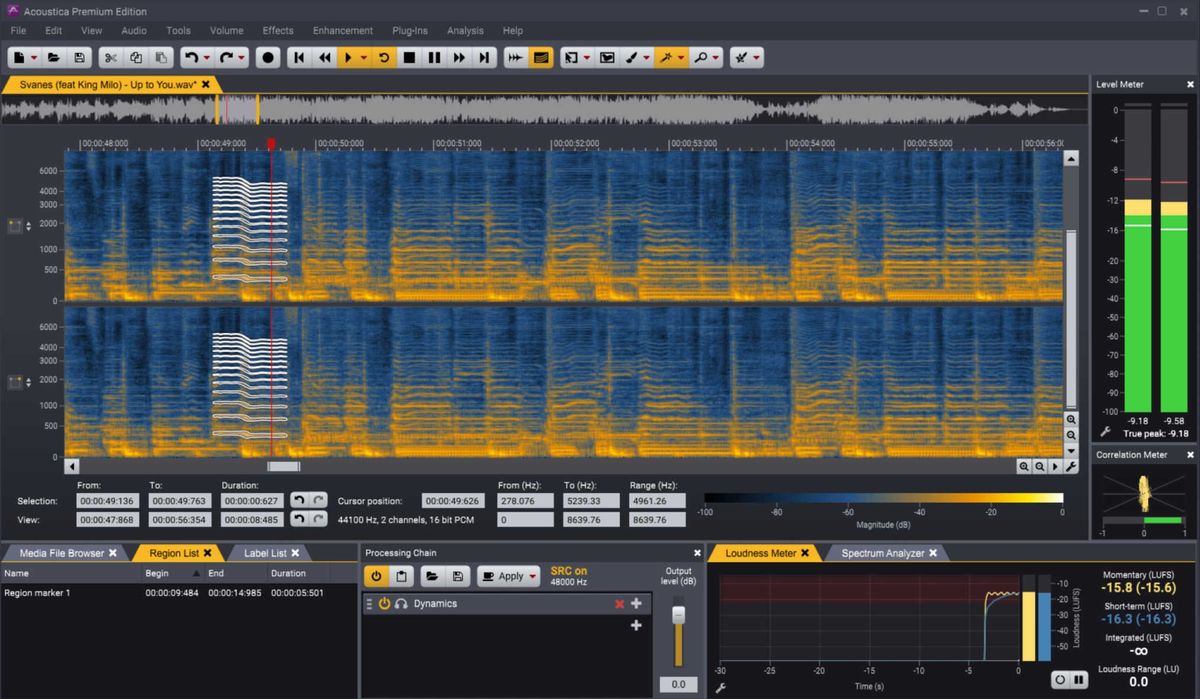 最新にして高品位のオーディオ処理ツールが満載です。マルチバンド処理における位相問題を解決したダイナミクスツールやEQ、ハイブリッドリバーブやコーラスなどの高品位エフェクトが、サンプルレート変換、タイムストレッチ、ピッチシフトなどとともにAcousticaに統合されています。これらの多くは、オーディオプロセッシングチェーンを利用してマルチエフェクトとしてリアルタイム処理に使用することも可能で、お決まりのプロセッシングチェーンを保存して、別のファイルやバッチ処理に利用することもできます。そして、汎用のプラグイン規格:VST、VST3およびAU(macOSのみ)も扱う事が可能で、プロセッシングチェーンに追加して、内蔵ツールと併用できます。