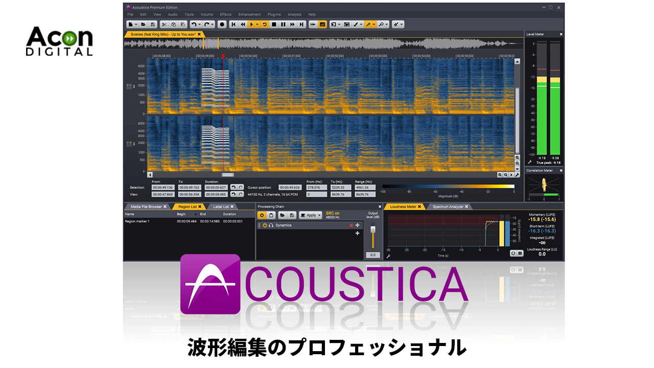 Acousticaは、最大32bit/384kHzに対応したすべての作業を最高品質でおこなえる最先端のオーディオエディターです。
