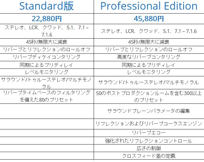 スタンダードバージョンは、シンプル操作ながら、自然かつ奥行きのあるサラウンドリバーブ効果を実現します。サラウンドチャンネルごとの細かな操作など、より詳細な空間デザインをする場合は、プロフェッショナルバージョンをお勧めします。