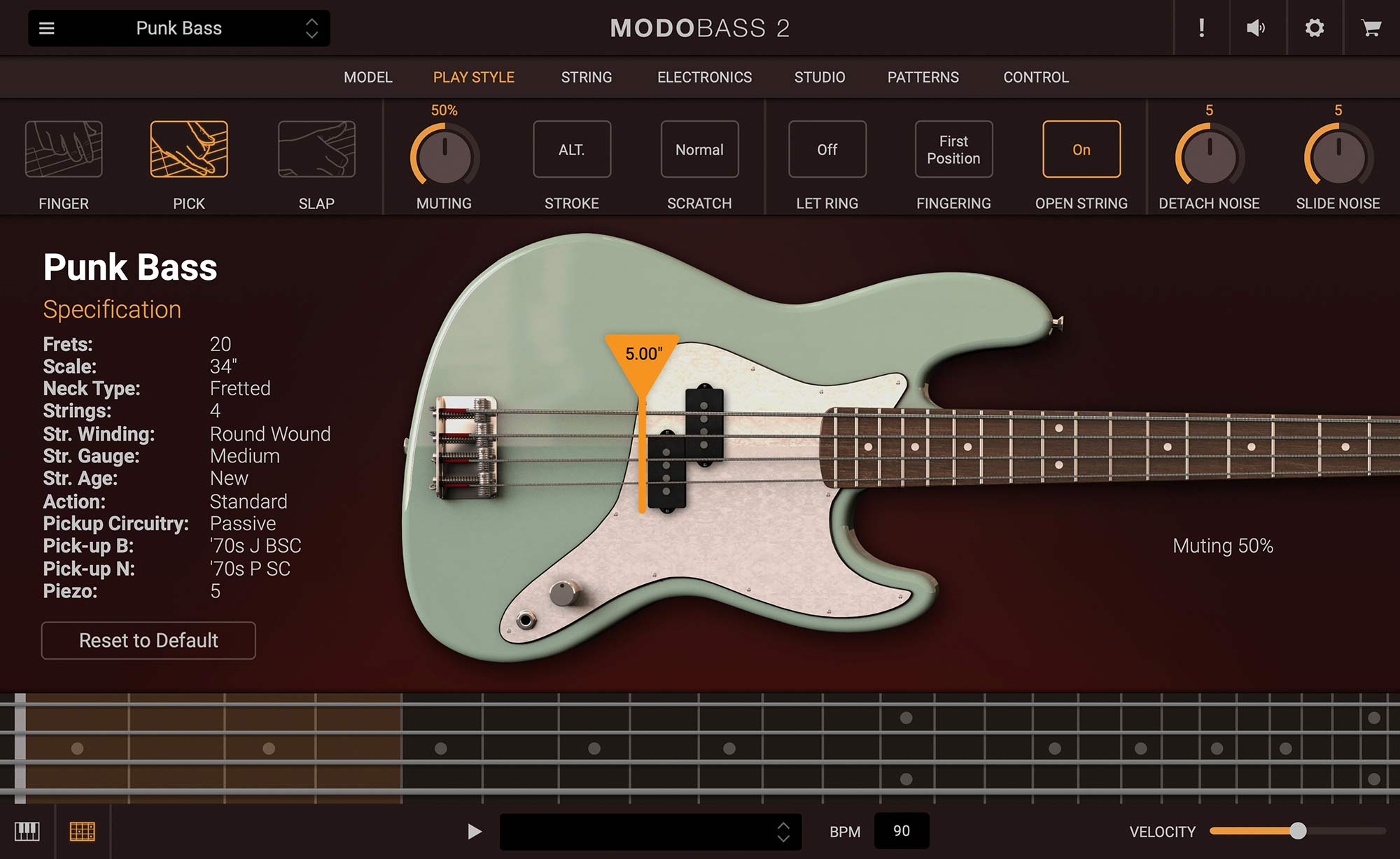 MODO BASS 2では、「PLAYSTYLE」画面で選択可能なピック、スラップ奏法のアルゴリズムもさらに磨かれて、これまで以上にリアルな演奏フィールを再現可能になりました。弦を弾く位置、強度、方向、弦の振動によるデタッチ・ノイズ、スライド・ノイズなどさまざまな調整機能と組み合わせることで、単調になりがちなMIDIファイルに生命を吹き込み、ベース、楽曲全体を新たな高みへと昇華させることができます。