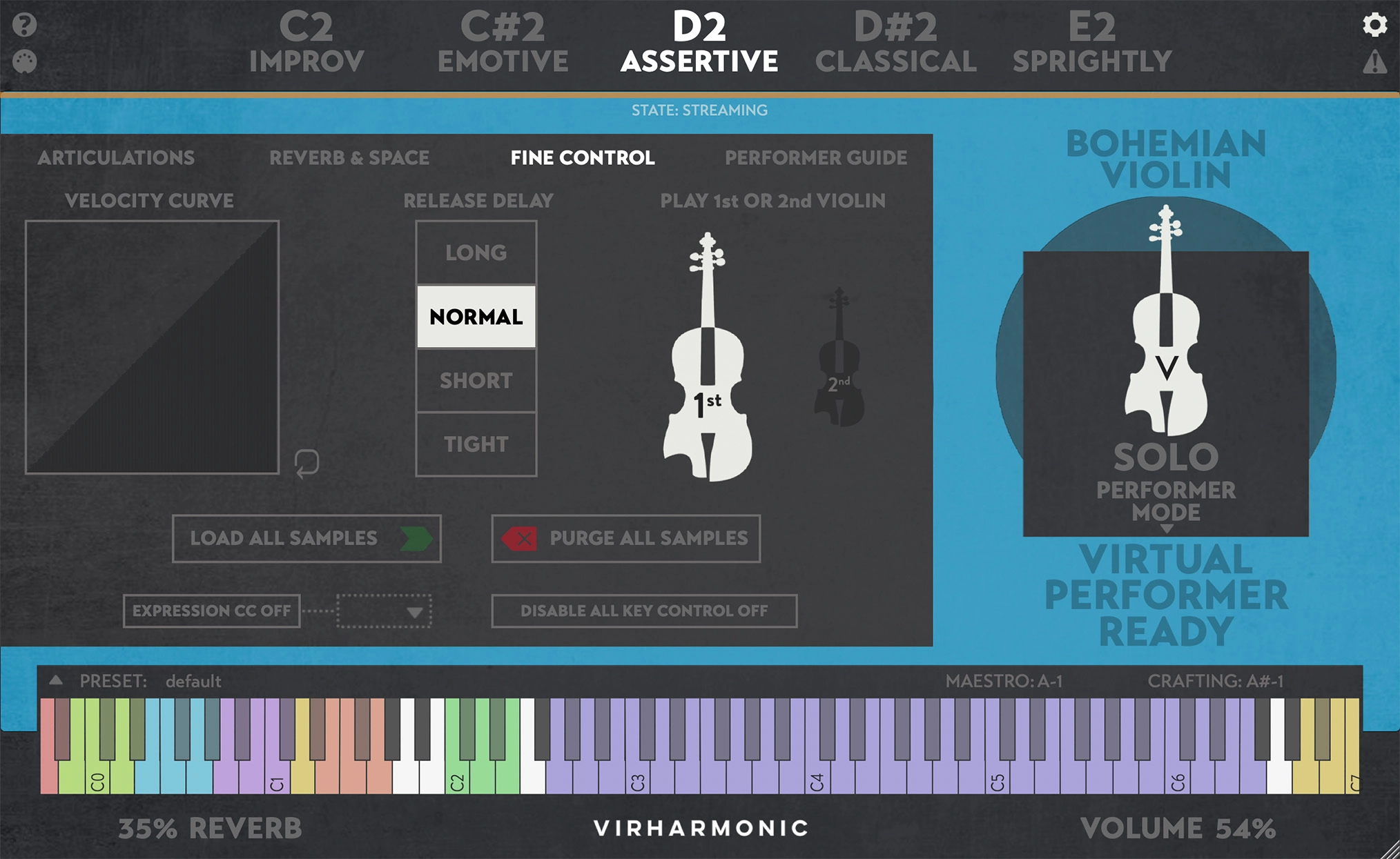 バーチャルパフォーマーは想像を超えた簡単さでリアルなバイオリン演奏を鍵盤で可能にし、演奏スタイルに基づく弓の種類、レガート、弓の位置を自動選択します。