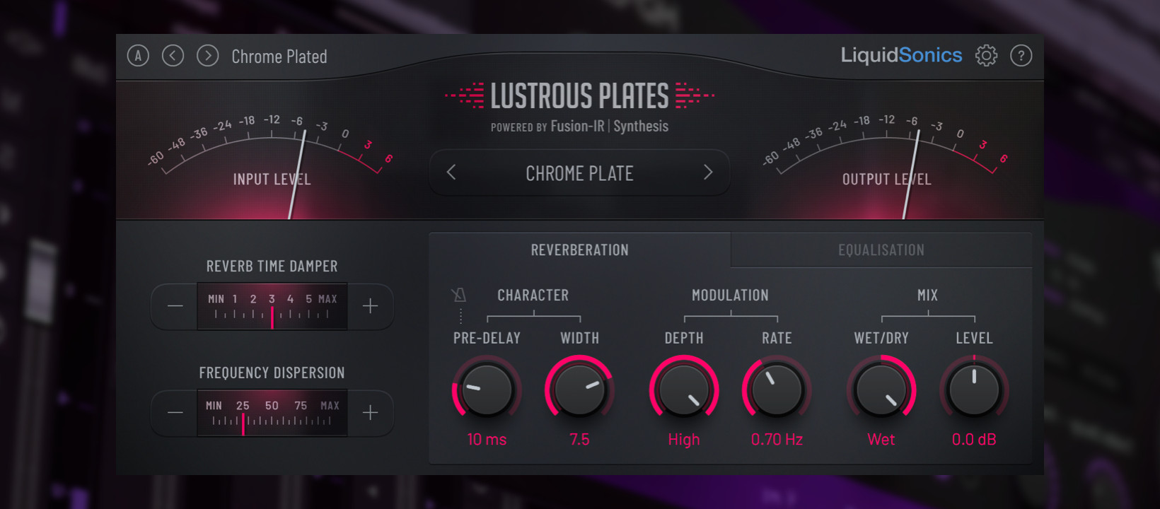周波数によって異なるディレイの変化率をシミュレートすることは、説得力のあるプレートリバーブの響きを得るために不可欠です。実際のプレート分散では、主にプレートのサイズとピックアップ位置によって決定されますが、金属素材、張力、取り付け方法などの要因がすべて、響きの違いを生みます。Lustrous Platesでは、各プレートのシミュレートされた分散量はすべて、"周波数分散"パラメーターの操作一つで、迅速かつ効果的に望む効果を得ることができます。