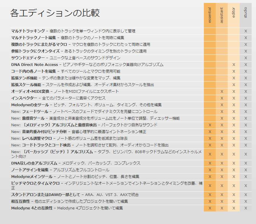 この販売ページはessentialです。Melodyneが誇る全ツール(ピッチ、フォルマント、ボリューム、タイミング、その他)を使用できます。ボーカルのみで、ポリフォニックを使わないなら、こちらが高コスパです。将来的に上位バージョンへアップグレードもbeatcloudでできます!