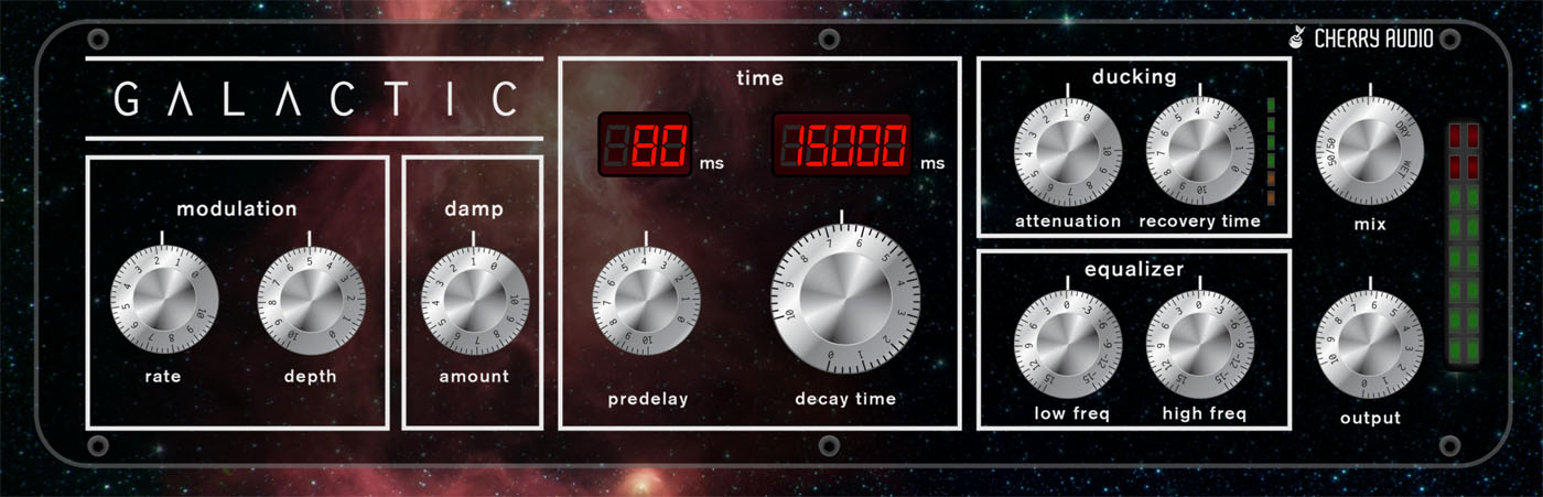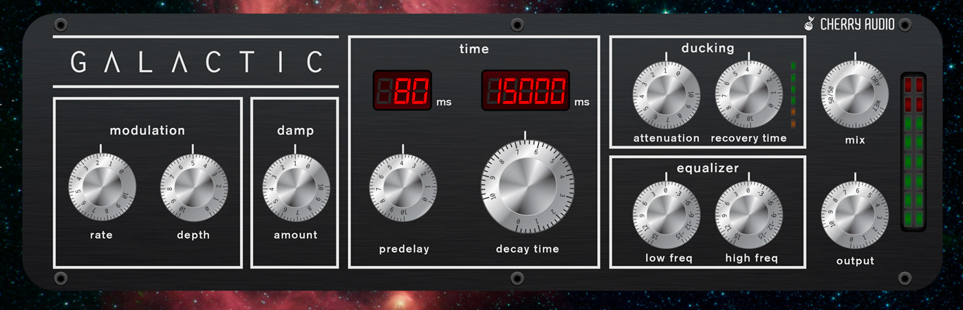 Cherry Audioの大人気バーチャルインストゥルメントDreamsynthのリバーブアルゴリズムをベースにしたGalacticプラグインは、モジュレーションコントロール、プリディレイ、イコライザーを追加しています。また、サイドチェインなしで、シンガーや楽器の演奏中に自動的にリバーブ・レベルを下げてミックスの透明度を向上させるダッキング機能も追加されました。また、ダッキングを使用すると、ドライとリバーブテイルを劇的に交互に切り替えることができ、Galacticを他のスペイシーリバーブとは一線を画しています。