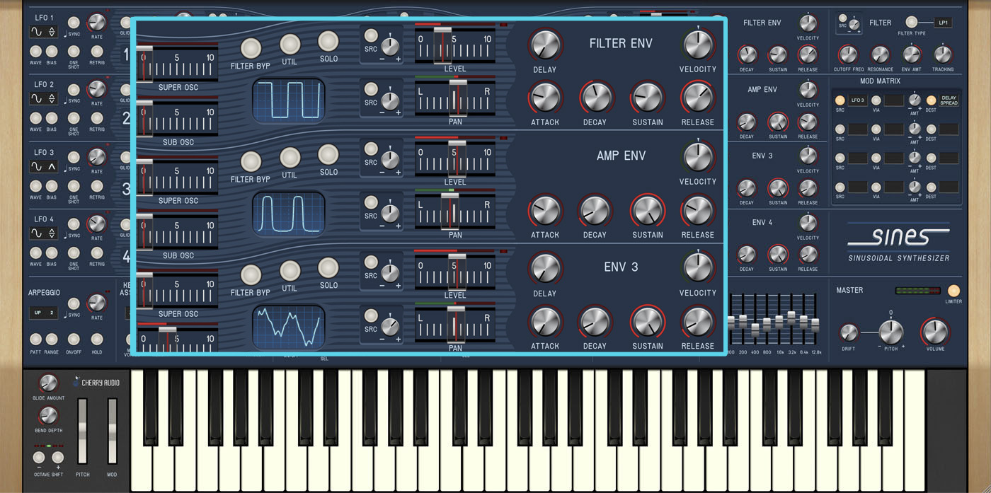 Sinesは、Cherry Audioのこれまでで最も広範なマルチモード・フィルター、14の波形による4つのLFO、4つのエンベロープ・ジェネレーター、アルペジオ、Cherry Audioの最も高く評価されているエフェクトの「ベスト盤」、ドリフト機能、内蔵8バンド・グラフィックEQを搭載しています。