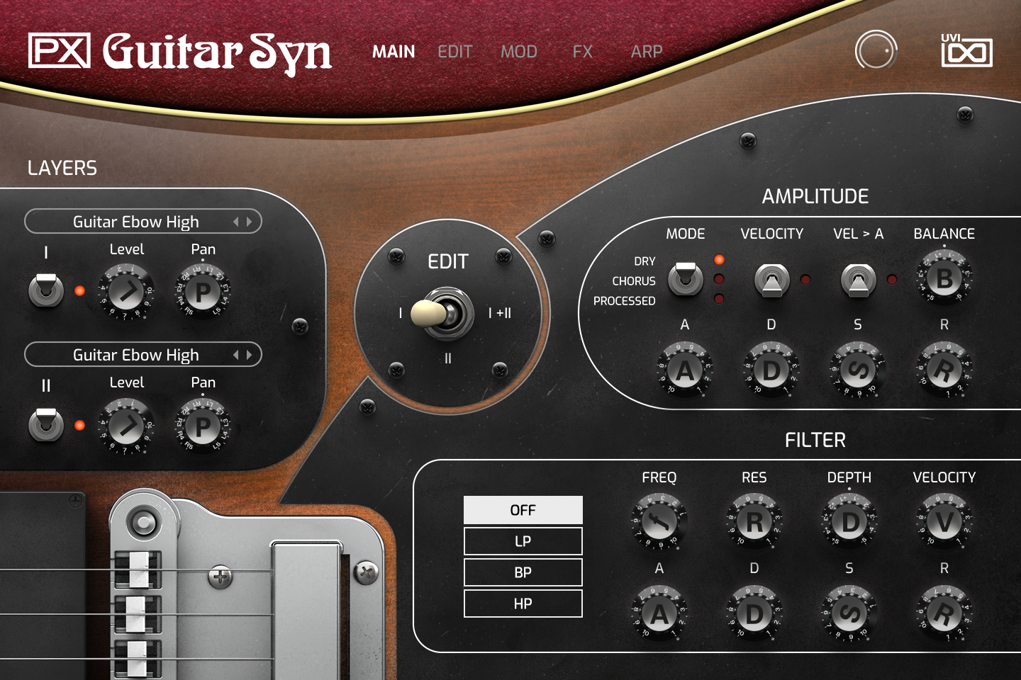 PX Guitar Synは、パッチを作成および編集するための堅牢で機能的なツールセットを提供します。ADSRアンプエンベロープ、エンベロープを備えたマルチモードフィルター、グライドを備えたポリまたはモノモード、ピッチシフトと高度なステレオモード、便利なモジュレーションホイールマッピングを備えたデュアルレイヤー・アーキテクチャから、LFO とステップ モジュレーター、2つの機能豊富なアルペジエーター、そして豊かなスイープ可能なクロスオーバー、ドライブ、Thorus、アンサンブル、Phasor、デジタルディレイ、Sparkverb、3バンドEQを含む様々な高品質エフェクトが利用できます。