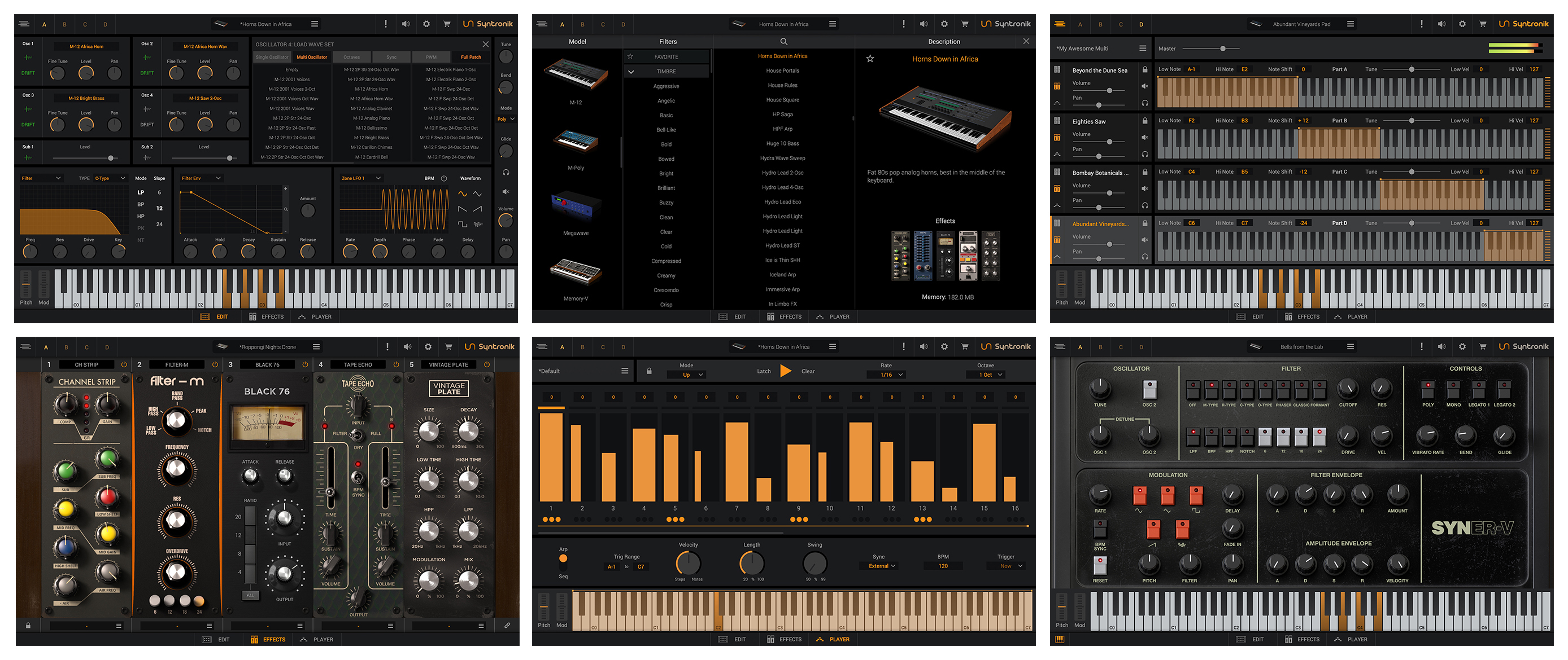 Syntronik 2には、Vintage Plateなど新たに加わった33種のエフェクトを含め、ミックス/マスタリング・プラグインT-RackS 5、MixBox、ギター/ベース・エフェクト・アンプ・プラグインAmpliTube 5譲りのエフェクター・モデルが71種類用意されています。インターフェースにはランチボックス・スタイルの縦型モジュールが採用され、5つまで同時使用可能なスロットが実装されています。クリエイティブなモジュレーション・エフェクトも多いので、モジュラーをパッチするようにサウンド・デザインをお楽しみいただけます。