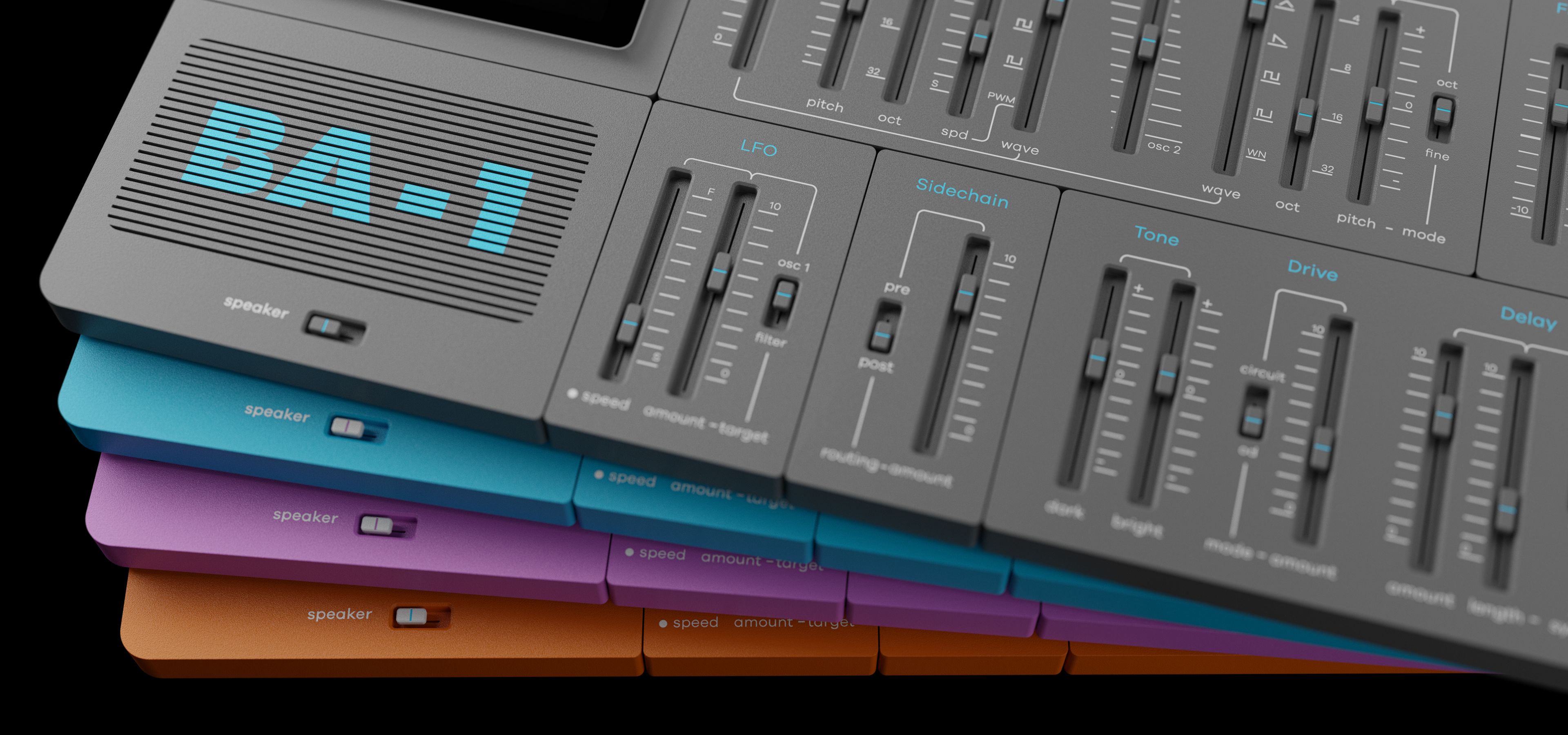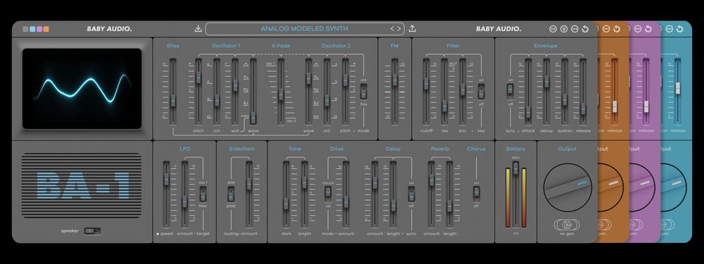 スタジオで長時間作業した後は、新しいものを見るのが気持ちいいものです。BA-1では、グレー、ブルー、パープル、オレンジのカラーモードを切り替えることができ、常に新鮮な状態を保つことができます。色のついた四角をクリックすると、オプションが表示されます。