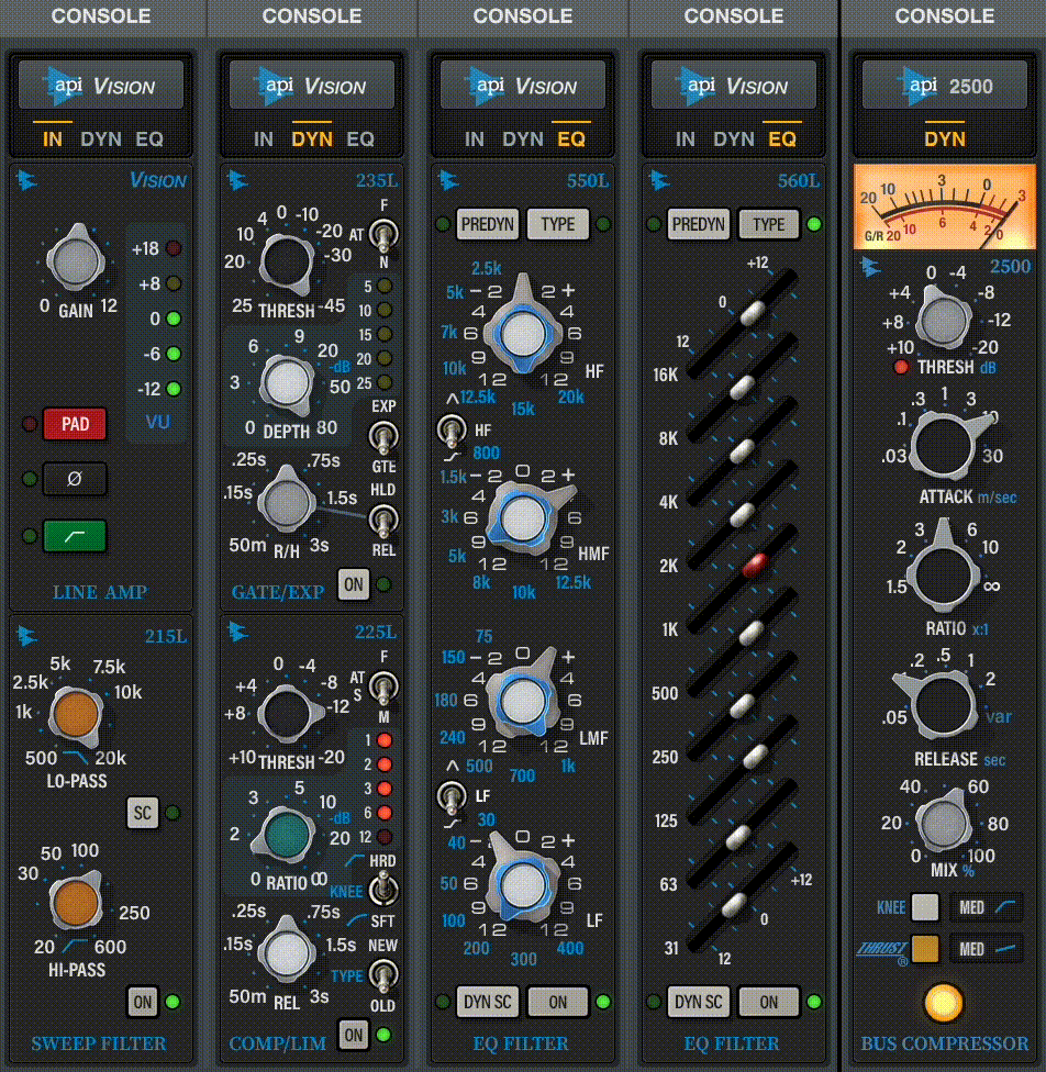 API Vision Console Emulationの各チャンネルストリップでは、APIの象徴的なLシリーズのモジュールを6つ使用することができます。212L preamo、カラフルな225L compressor、235L gate/expanderによるパンチと存在感、そして550L/560L EQ、スイープ可能な215L Hi/Loパスフィルターのパワフルなトーンシェイピングまで、大胆なAPIトーンをリアルタイムで造形することができます。