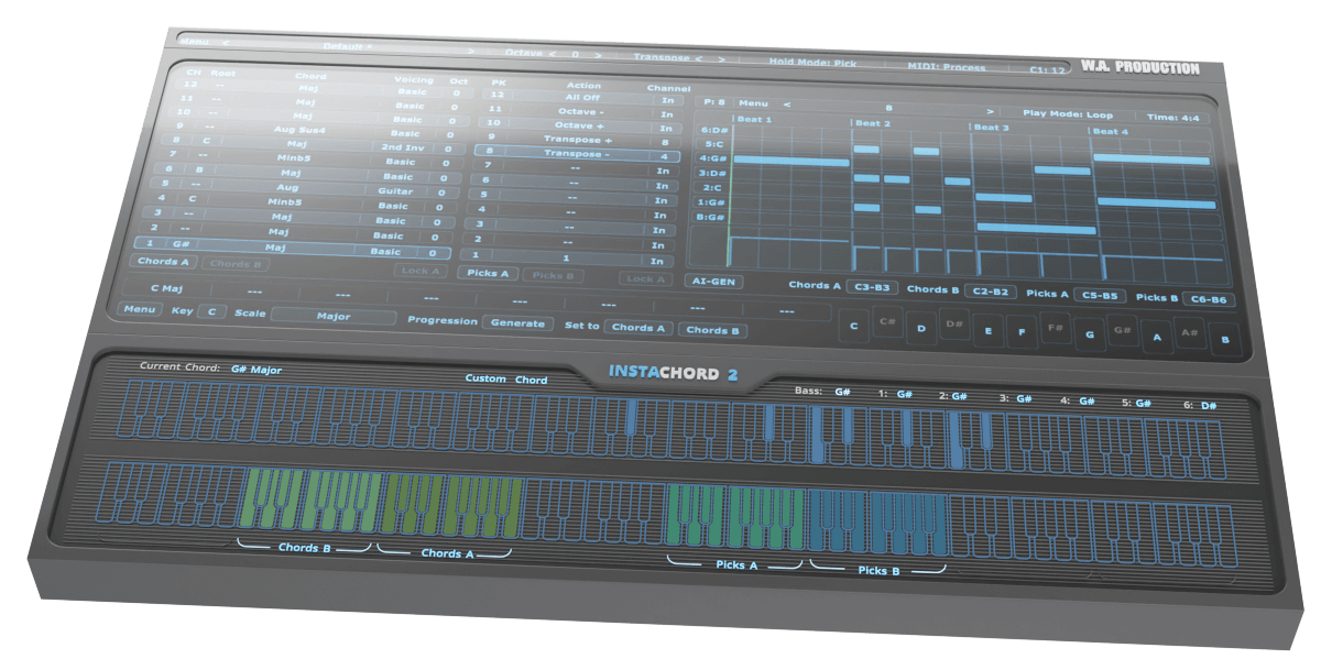 コードとピックを演奏する方法は、パターン・エディターで完全にカスタマイズできるようになりました。例えば、コードのトップ3音を叩くキーと、残りの3音でリフを演奏するキーを割り当てることができます。また、コードの個々の音を別々に演奏することもできます。そのため、手動でコードをアルペジエイトしたり、かき鳴らしたりすることも可能です。