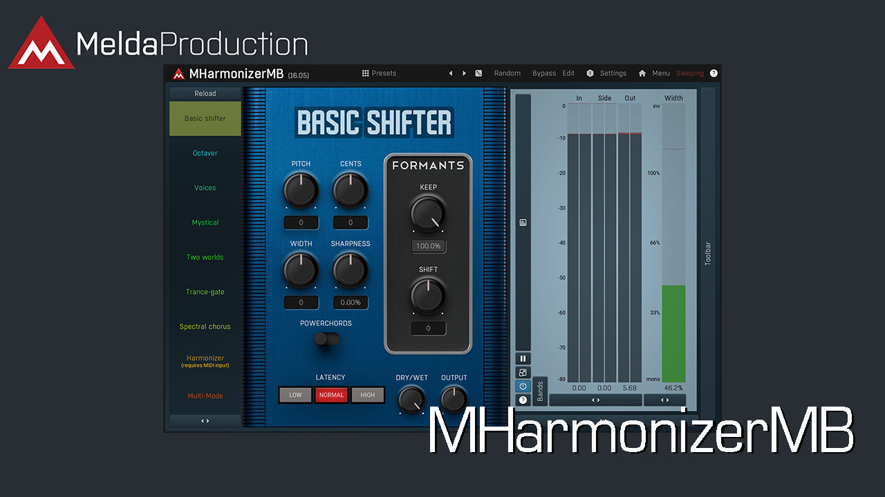 MHarmonizerMBは、ピッチシフトやマルチボイスのハーモナイザーといったエフェクトを駆使したプラグインです。