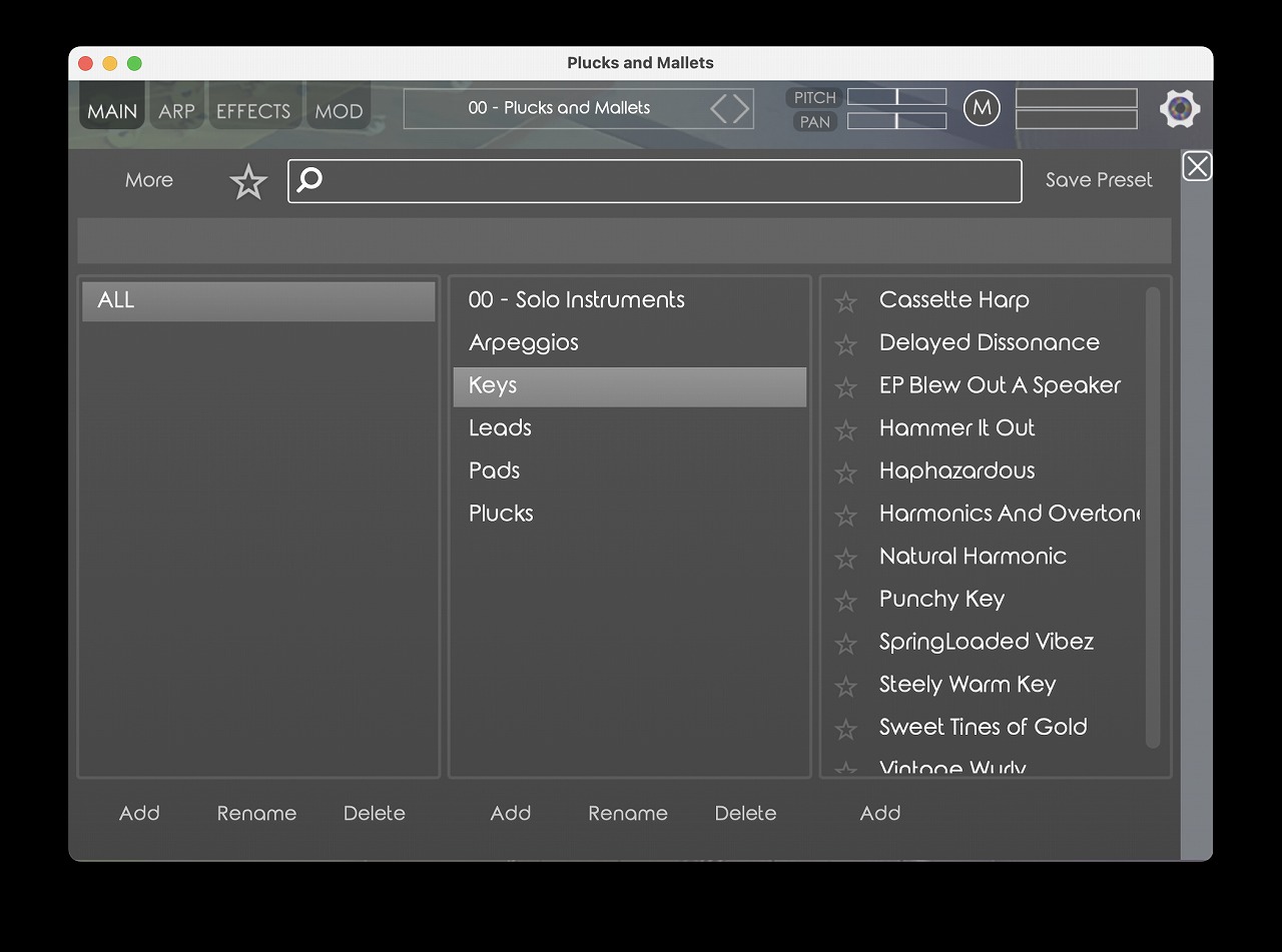 すべてのプラグインにはアルペジエーターとメロディービルダーがあり、実際には再現できないかもしれないサウンドの演奏にする手助けにもなります。