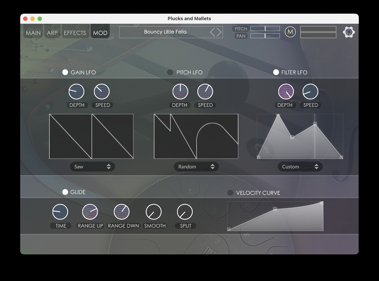 - 6 つの形状オプションを備えた 3 つの LFO (ゲイン LFO、ピッチ LFO、フィルター LFO)