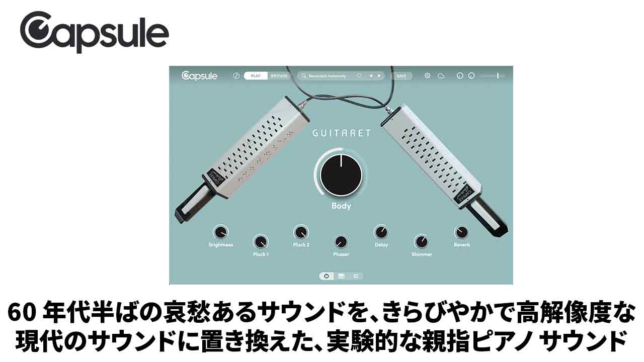 Guitaret は、60 年代半ばの哀愁あるサウンドを、きらびやかで高解像度な現代のサウンドに置き換えた、実験的な親指ピアノ(カリンバ) サウンドを再発明したカプセルです。