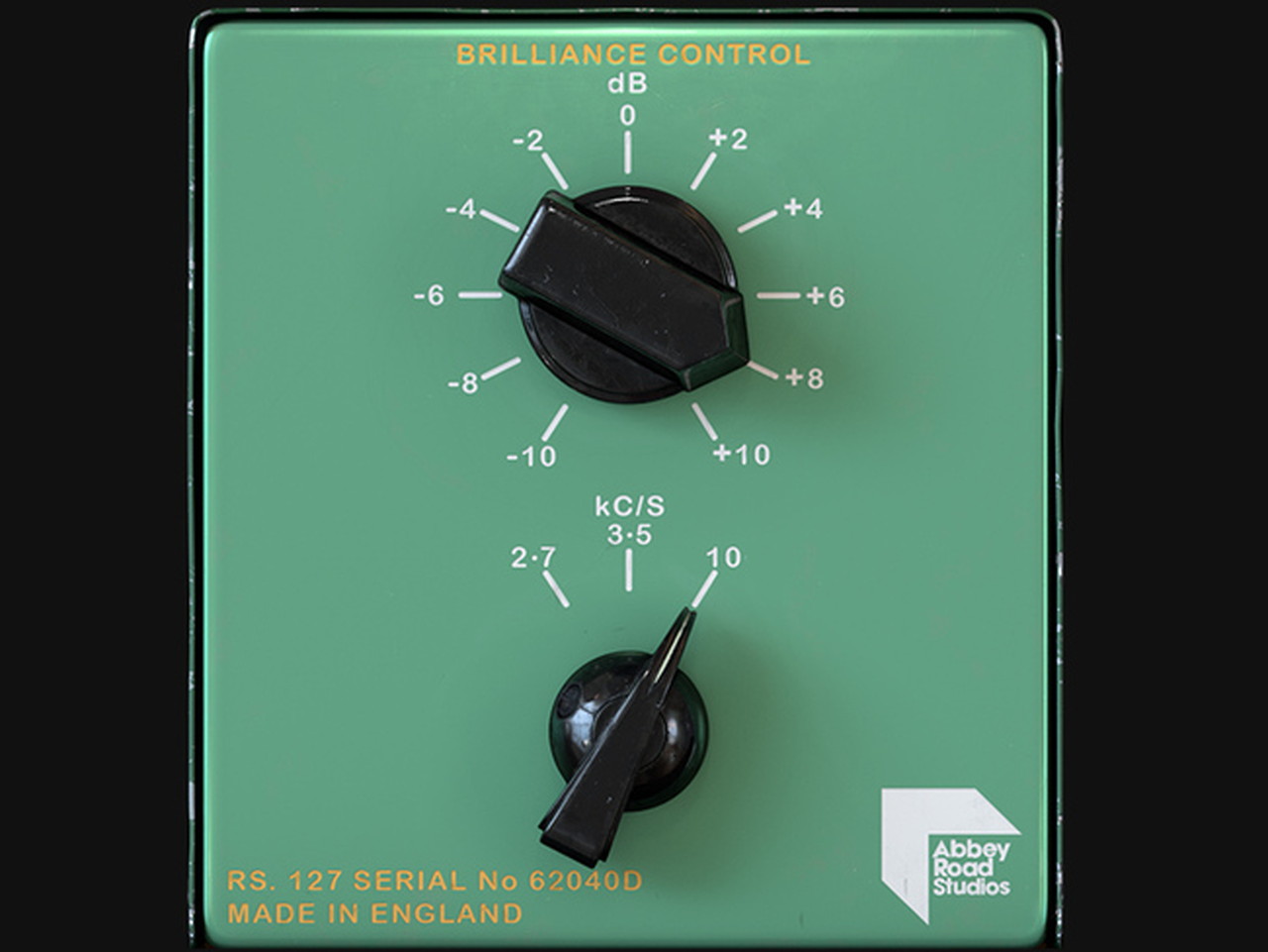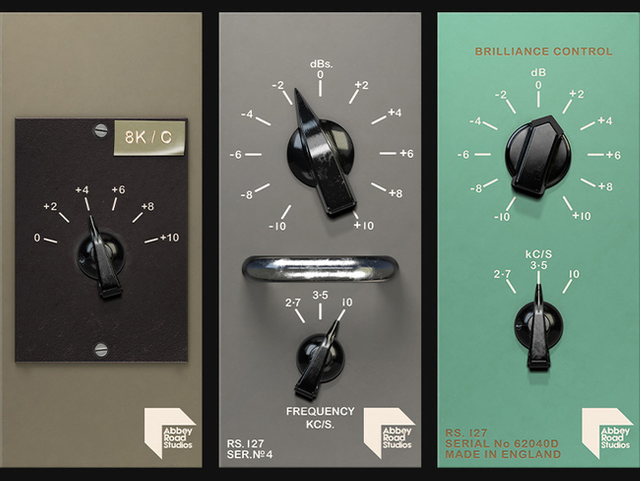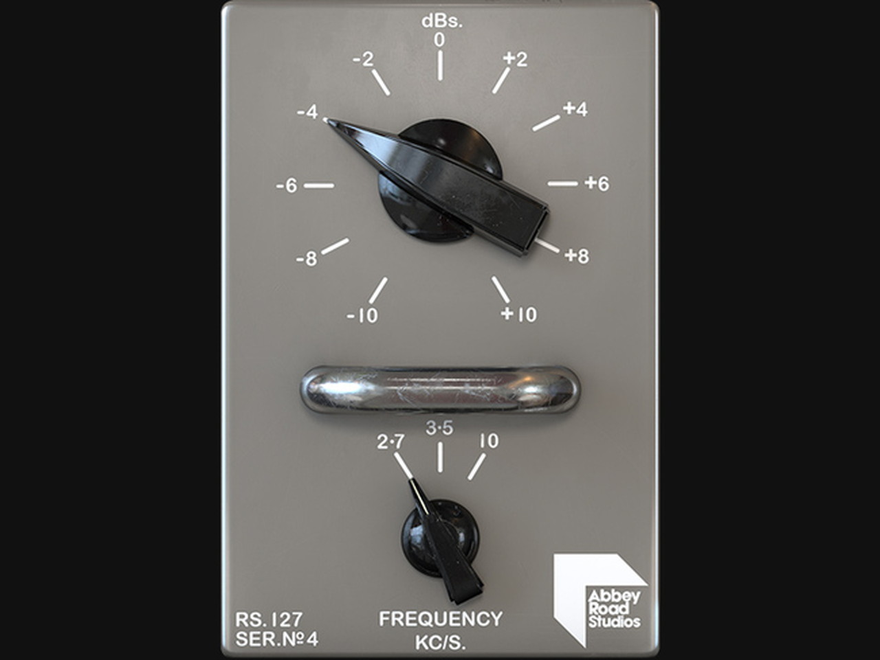 灰色のRS127はオリジナルのアビー・ロード・スタジオのトレブル・イコライザーです。2.1、3.5、および10 kHz(かつての単位はキロサイクル毎秒)で10 dBまでブーストまたはカットできます。