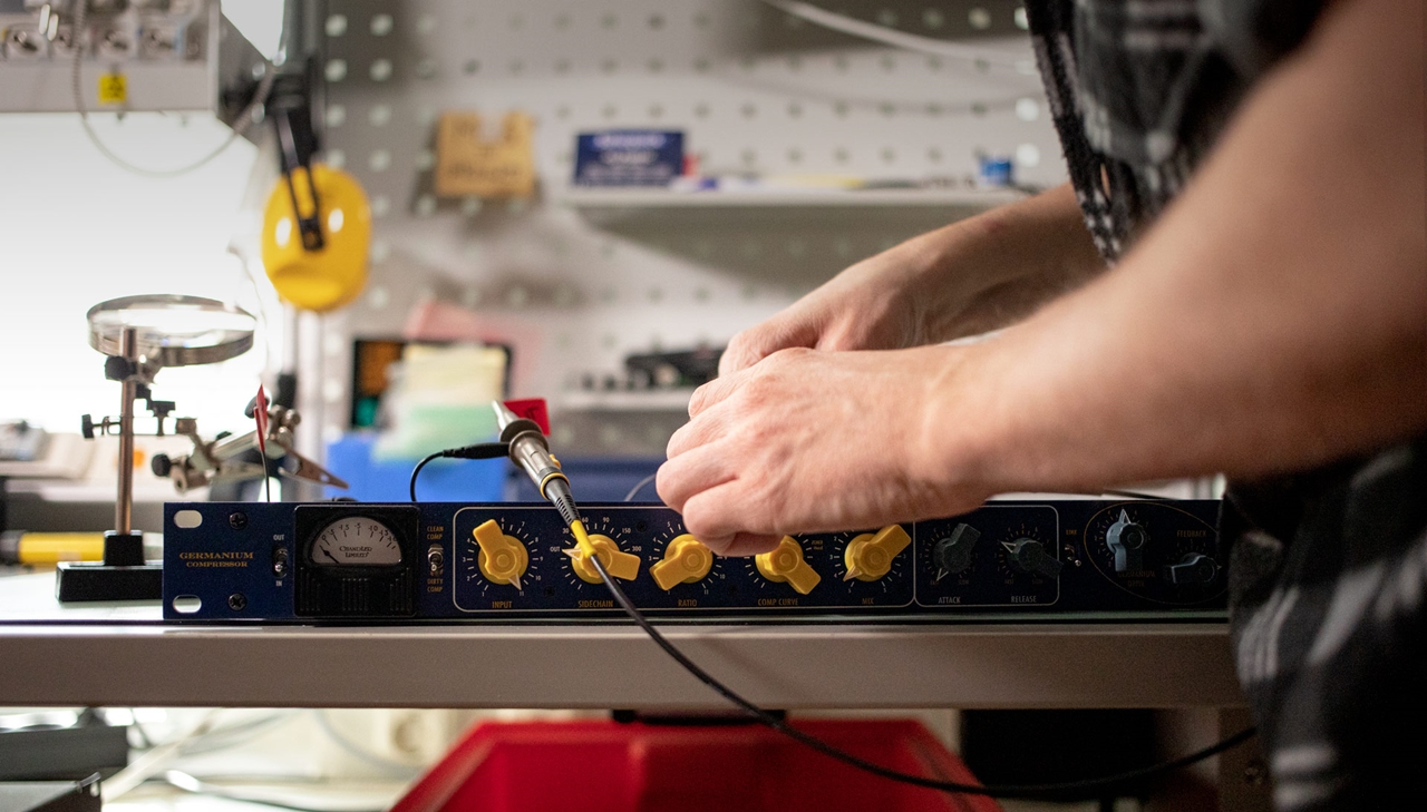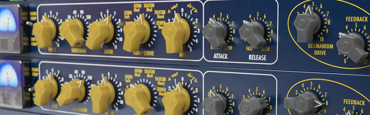 FETによるゲイン・リダクション素子と相まって、ゲルマニウム・トランジスターは高速で飽和の激しいコンプレッションを可能とします。このため、モードを切り替えてクリーンなコンプレッションとダーティーなコンプレッションのいずれかを選択でき、各モードでは多かれ少なかれ、ユニットから自然に生じる倍音の励起が相殺されます。透明ではありませんが、全高調波歪を大幅に制御できます。