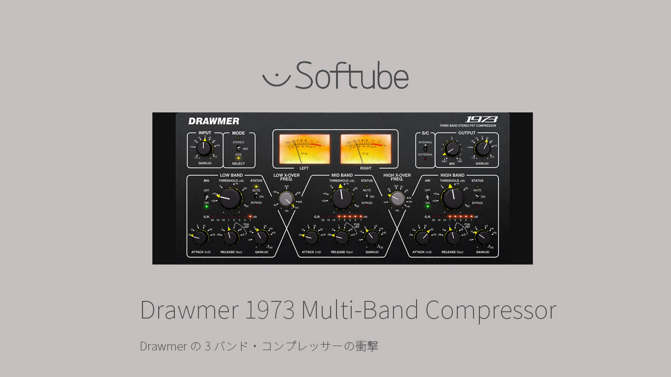 Drawmerの研究/開発チームの協力の元、オリジナル・ハードウェアを入念にモデリングしたSoftubeのDrawmer 1973マルチバンド・コンプレッサーは、アイバー・ドローマー氏自らが承認。