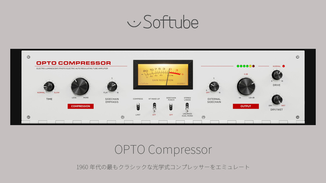 OPTO Compressorは、プロ・オーディオの世界では定番となっている真空管光学式コンプレッサーのスロー・アタックとスムーズなキャラクターに加え、DAWに理想的な特性と幅広いパラメーターを備えています。