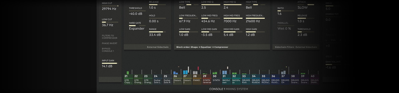 Console 1のDriveノブは歪みの量を決めます。Characterノブは、アナログ版と同様、追加する歪みを2次歪み(真空管寄り)から3次歪み(トランジスタ寄り)、またはこの中間に変化させます。