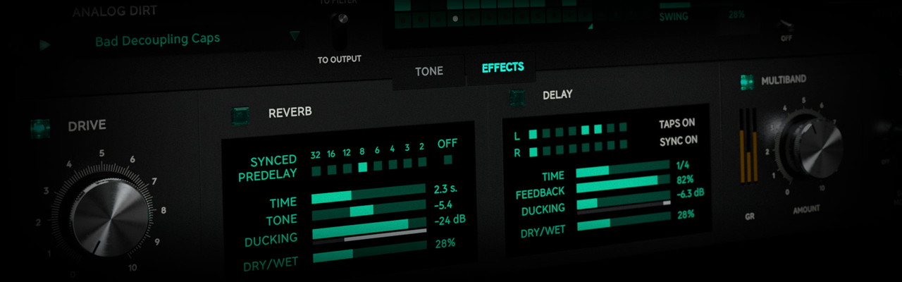 ディレイとリバーブはシンセサイザー・サウンド向けにデザインされており、同期したプリディレイ、リバーブのダッキング、8つの個別の左右のタップ、ディレイのダッキングといった機能を備えています。