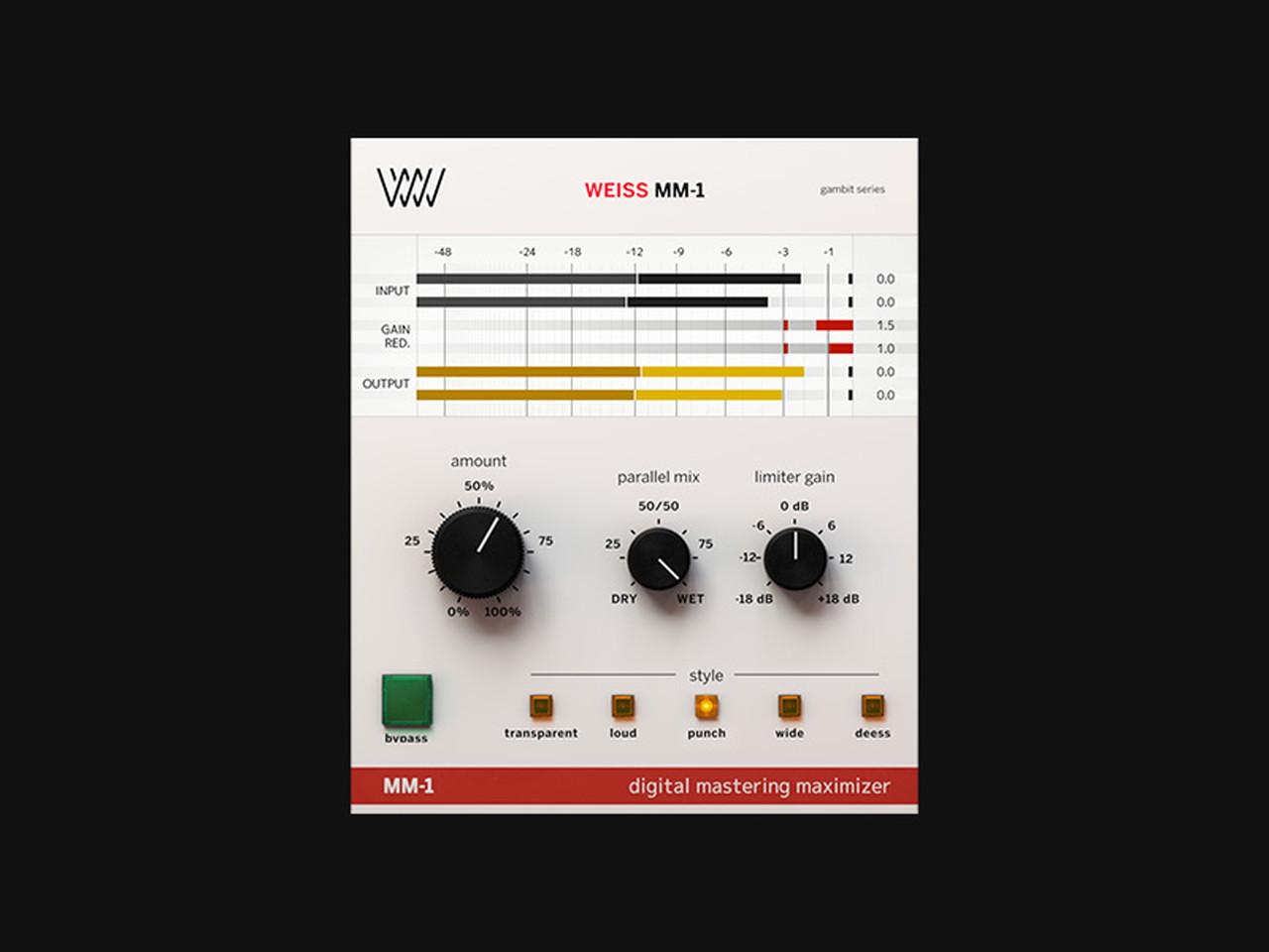 オリジナルのデジタル・ハードウェアWeiss DS1-MK3と同じアルゴリズムを搭載したWeiss MM-1は、トランスペアレント、ラウド、パンチ、ワイド、ディエッサーの5つのリミッティング・スタイルを備え、「amount」ノブを回した分だけインテリジェントにマキシマイズ処理が施され、ミックス・コントロールでドライ/ウェットのブレンドも可能。