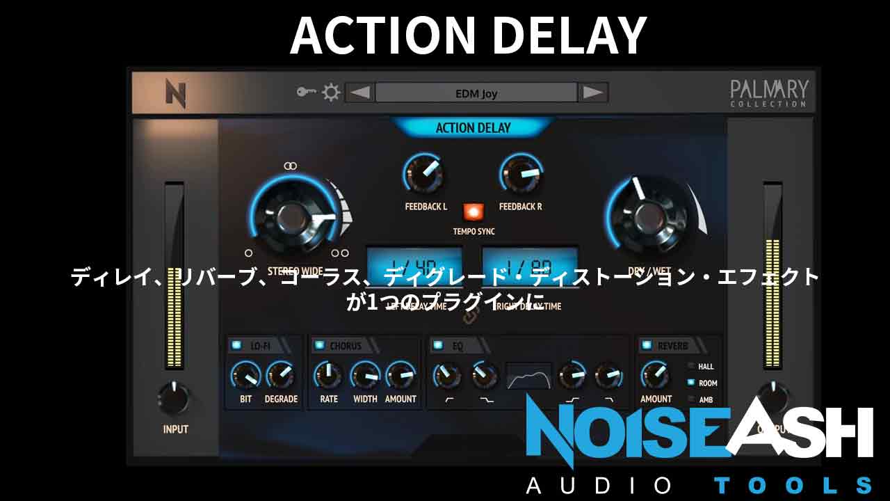 Action Delayは、アナログ・ディレイ、コーラス、リバーブ、LoFiディストーションFXプロセッサーの高度なコンビネーションです。文字通り4 in 1です。
