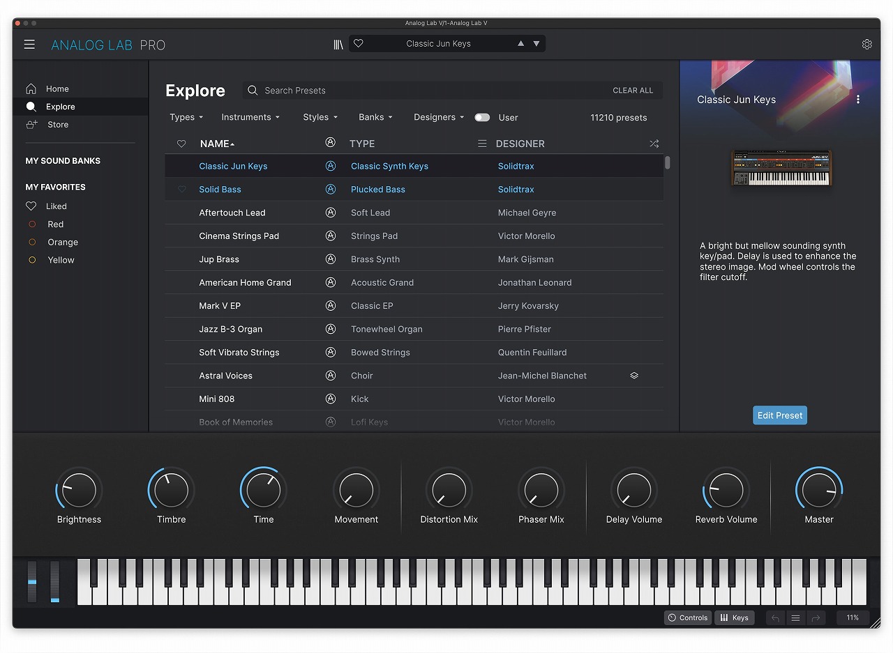 受賞歴のある V Collection、Pigments などから選ばれたピアノ、オルガン、アナログおよびデジタル シンセサイザーを探索してください。