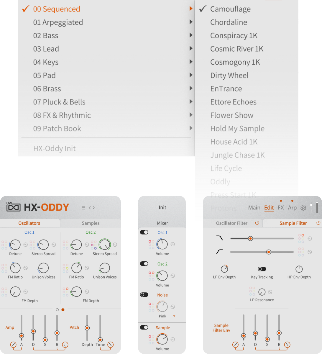 UVI の長年培われてきた熟練の奥深いサンプリングとフィジカルモデリング技術を活かした HX-ODDY は本格的なハードウェアサウンドを広範に探求するためのエキサイティングで新しい方法を提供します。新たに用意されたハードウェアサンプルベースのウェーブテーブルオシレーターを使用して、音色カスタマイズやデザインの幅を広げます。そしてハードウェアサウンドをより細かく、より忠実に表現する、愛情を込めて設計されたサンプルベースオシレーターと組み合わされ、フィジカルモデリングされたフィルターに送るすることで、強力なサウンドを生み出します。