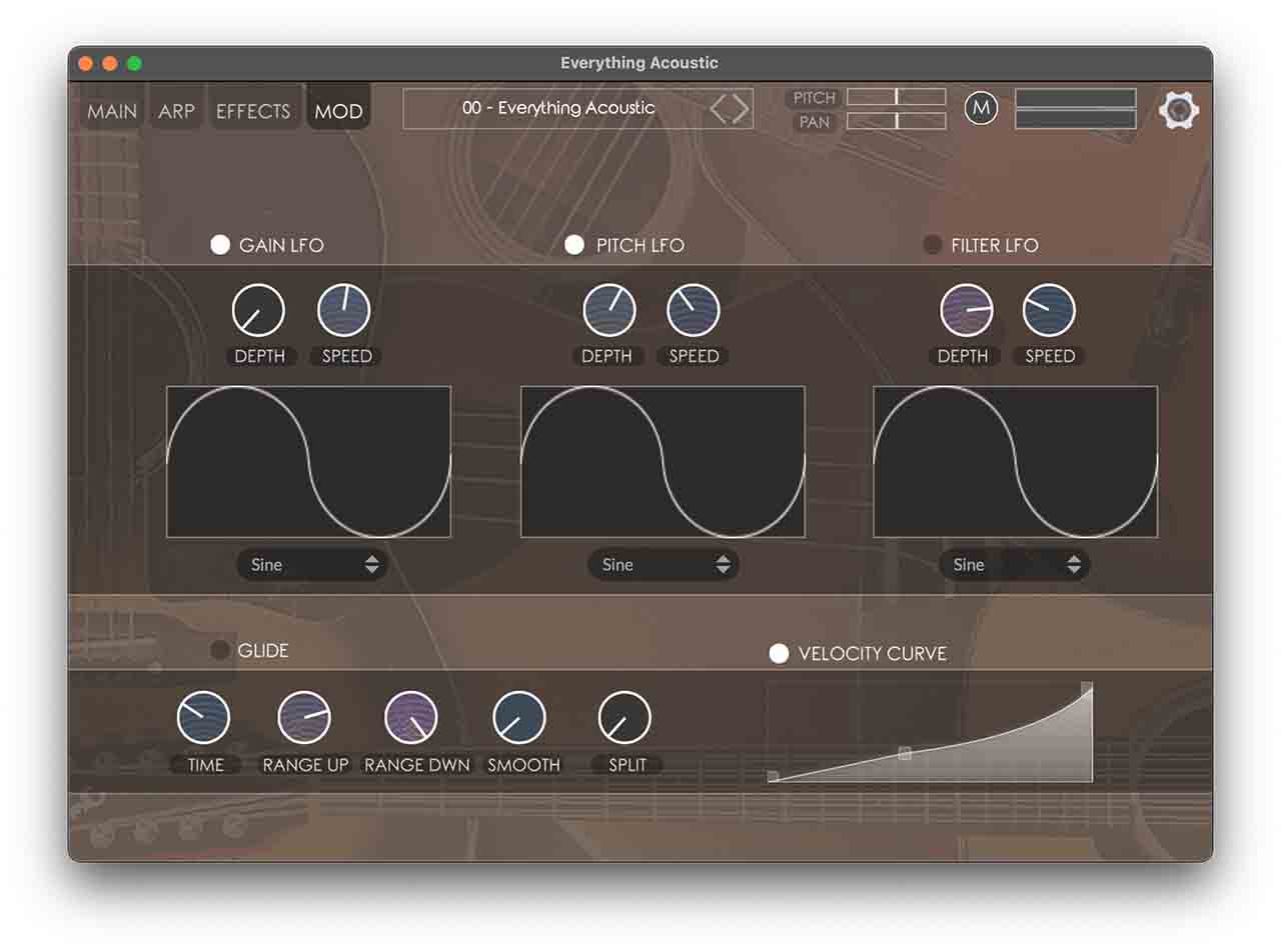 - 6 つの形状オプションを備えた 3 つの LFO (ゲイン LFO、ピッチ LFO、フィルター LFO)