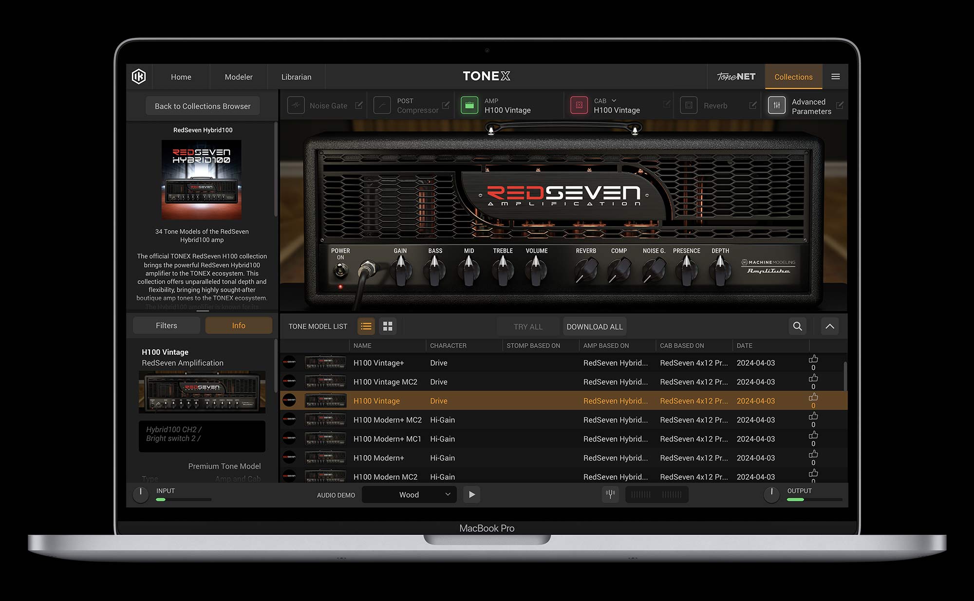 60年代スタイルの美しいクリーン・トーンからアグレッシブなハイゲイン・トーンまで、イタリアのアンプメーカー RedSeven のHybrid100アンプ からキャプチャーした、34種の Tone Modelを収録しています。全3チャンネルのトーン、ミッド・カット・セッティング、リード・ブースト、ヴィンテージとモダンのボイシングなど、Hybrid100のトーン・レンジを余すところなく再現します。また、本コレクションには、Amp/Amp+ Cab の両方の Tone Model が収録され、キャビネットには、Celestion Vintage 30を搭載した RedSeven4x12 ProCab が採用され、パンチと明瞭さを実現しています。