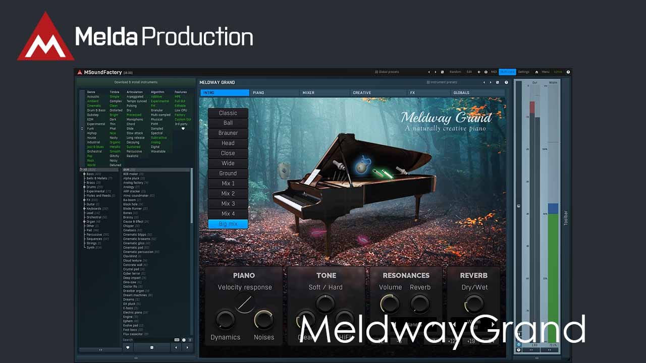 クラシック音楽、アンビエントでエモーショナルな音楽、サウンドトラックなど、あらゆるジャンルに最適です。Meldway Grand では、共鳴音を反響させて、あらゆるエモーショナルなジャンルで信じられないほどのサウンドを生み出します。