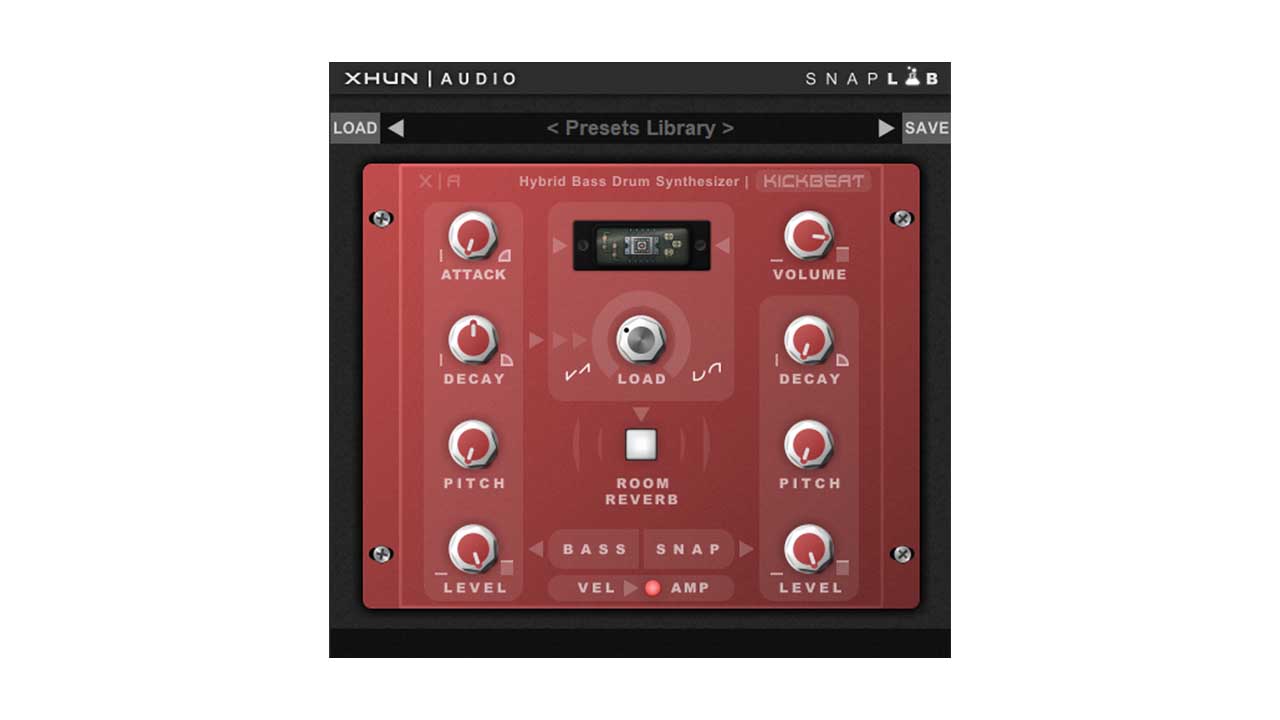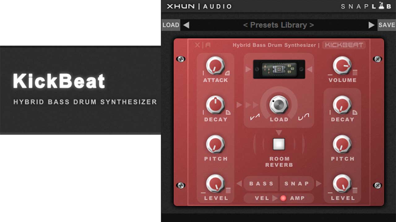 KickBeatは、その中心に、本物の 16 ビット整数精度デジタル合成技術 (90 年代後半のハードウェア デバイスで広く使用) と、アナログ モデルのトランジスタ ベースのサーチュレーション・サーキットを使用しています。また、デジタル リバーブ DSP アルゴリズムも組み込まれているため、KickBeat は、EDM、テクノ、トランス、アンビエント ミュージックなど、さまざまな音楽に深く、広く、大地を揺るがすような電子ドラム キックを生成できる可能性を秘めています。