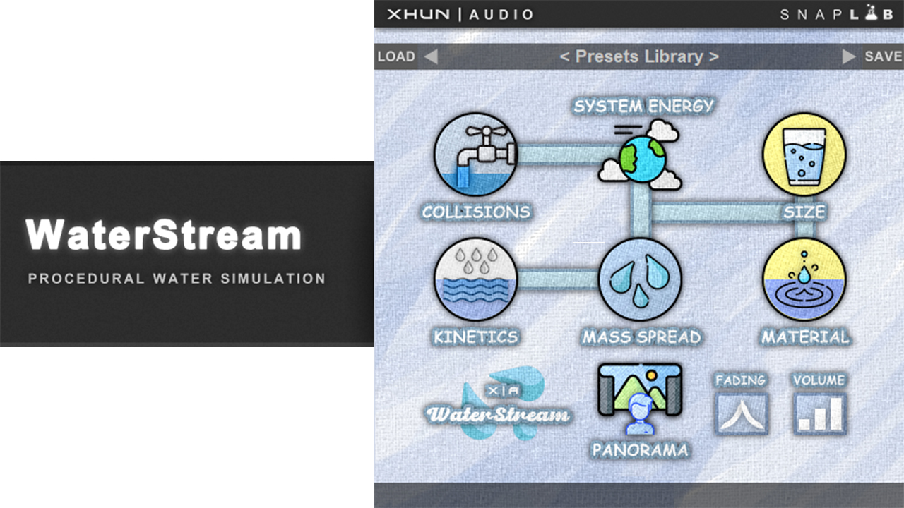 音楽、ライブ イベント、映画、テレビ、エンターテイメント制作のために生まれた WaterStream は、複雑で強力な物理的に正確な粒子衝突エンジンに基づいています。サンプルは一切使用せず、サウンドと流体力学は実際にリアルタイムで生成されます。WaterStream を使用すると、リアルな小雨、滝、土砂降り、川の流れのサウンドスケープなどを簡単に生成できます。